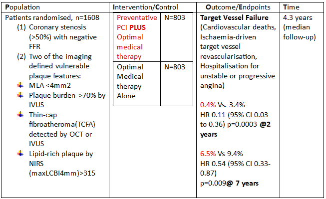 While these findings suggest that focal treatment of selected high-risk plaques may confer incremental benefit beyond contemporary OMT, important considerations remain, including low overall event rates, imbalance in dual antiplatelet therapy exposure, imaging-based lesion selection, and limited generalisability beyond predominantly East Asian populations. Further adequately powered, multi-centre randomised trials and real-world registry data are required before preventive PCI of non-obstructive vulnerable plaques can be adopted as routine clinical practice